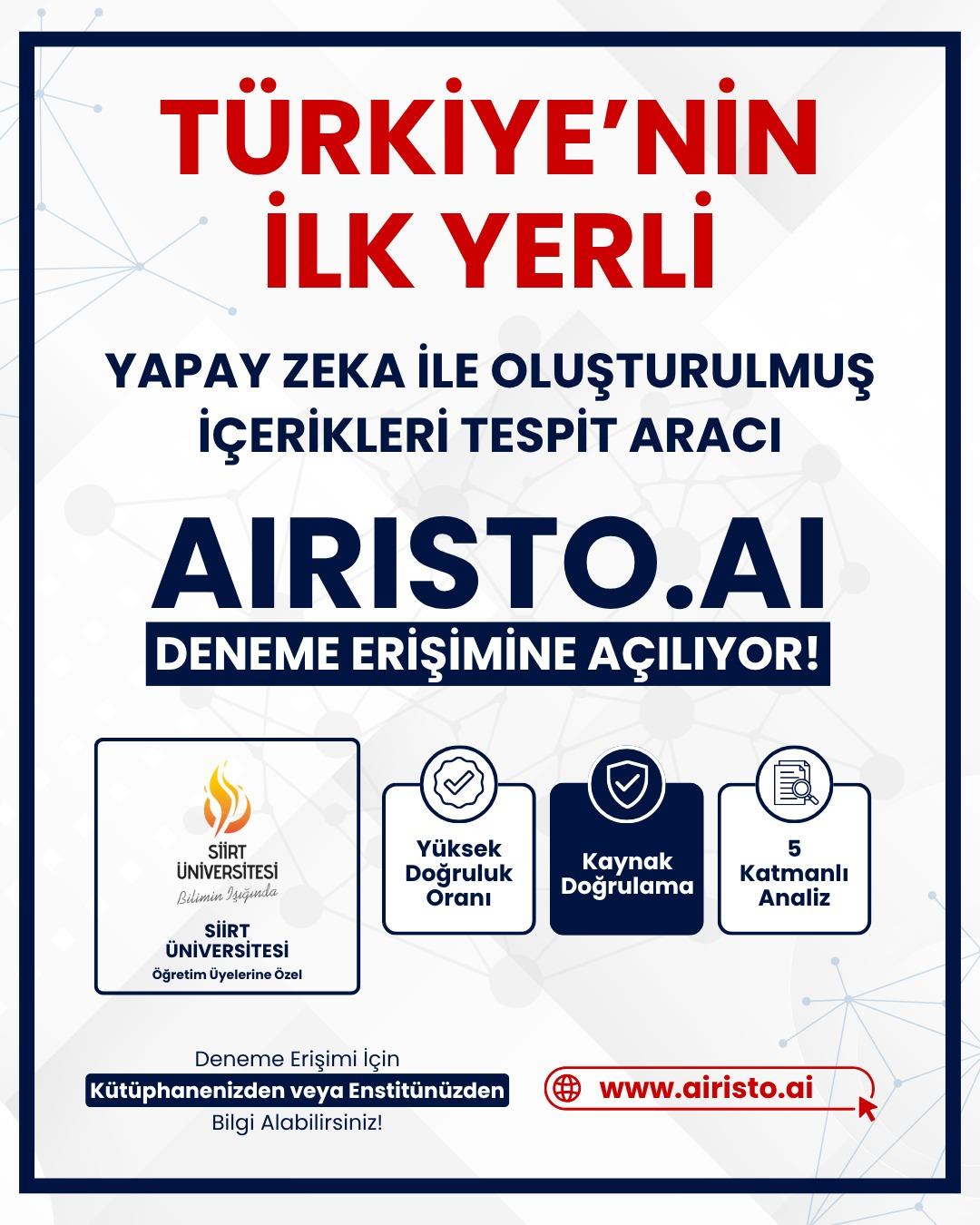 Airisto, tamamen yerli kaynaklarla geliştirilmiş bir yapay zeka içerik tespit aracıdır. Türkçe ve İngilizce akademik metinleri (tez, makale, seminer, bildiri vb.) çok kapsamlı bir şekilde dağıtılmakte ve “olası” yapay zeka üretim izlerini şeffaf, anlaşılır şekilde ortaya çıkanlarla rapor kapsamındadır. Airisto içerik tespit aracına www.airisto.ai adresinden ulaşabilirsiniz.